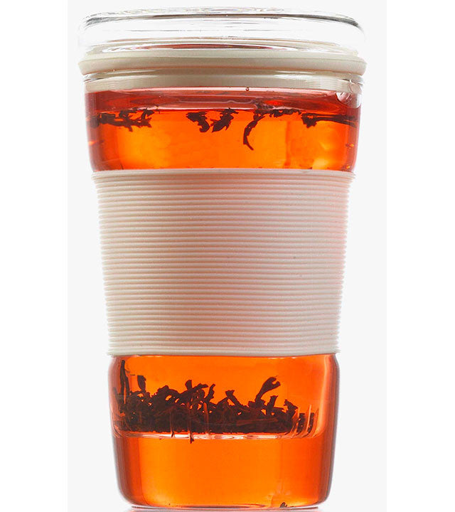 The Infuz is our most modern infuser tea mug. It features a deep glass infuser, which sits on a removable silicone seal, as well as a lid to keep the heat in. The soft grip makes it comfortable to hold even with hot tea inside the glass. The deep infuser allows plenty of space for teas to steep to give their fullest flavors. The Infuz makes it easy to re-steep your tea, and the lid doubles as a trivet for the infuser when you're ready to drink.
