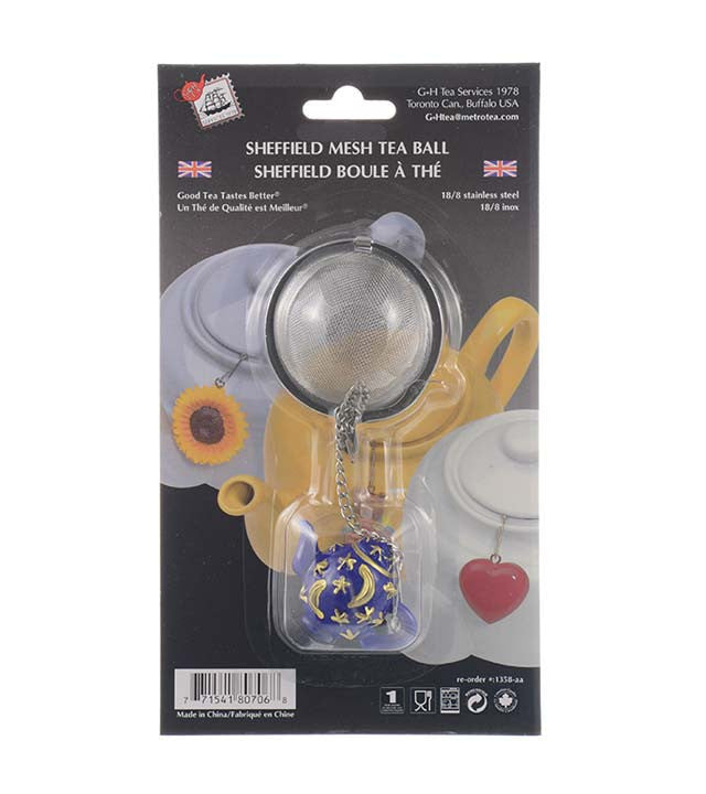 The Sheffield Mesh Tea Ball is a great accessory for any tea cup. It is perfect for steeping 1-2 cups of tea, as the leaves are able to be steeped more than once. The Tea ball is made of stainless steel and will not rust. The tea ball comes in multiple styles including: Blue cup, white cup, red cup, blue teapot, red teapot, white teapot, sunflower, red heart.