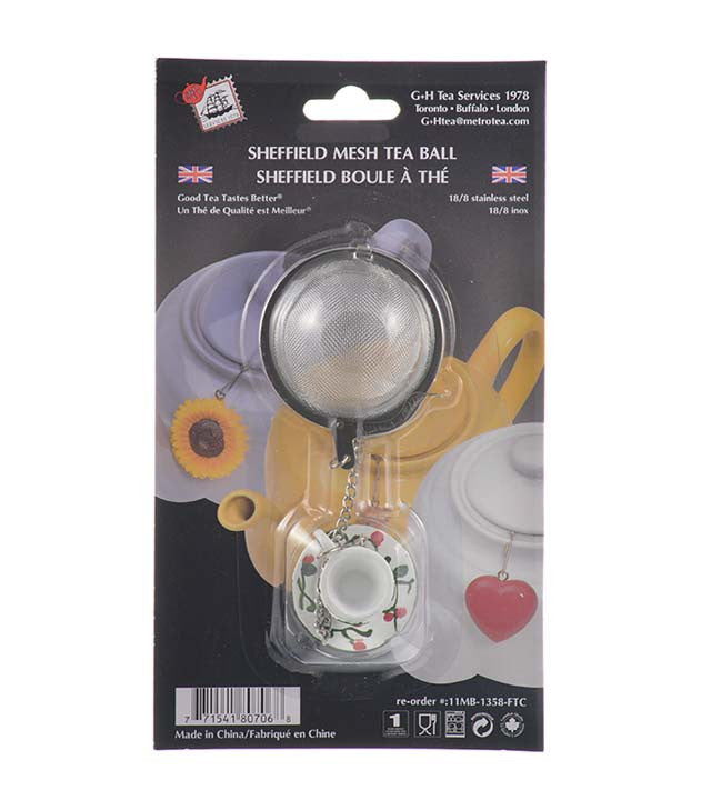 The Sheffield Mesh Tea Ball is a great accessory for any tea cup. It is perfect for steeping 1-2 cups of tea, as the leaves are able to be steeped more than once. The Tea ball is made of stainless steel and will not rust. The tea ball comes in multiple styles including: Blue cup, white cup, red cup, blue teapot, red teapot, white teapot, sunflower, red heart.